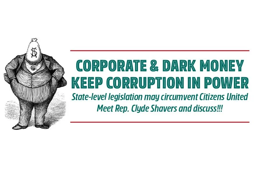 Representative Clyde Shavers will join us to discuss a new bill, inspired by the Transparent Elections Initiative (aka The Montana Plan) that he and his team are putting together. "This is the most promising new strategy to eliminate corporate and dark money in politics since the day Citizens United was decided." 1